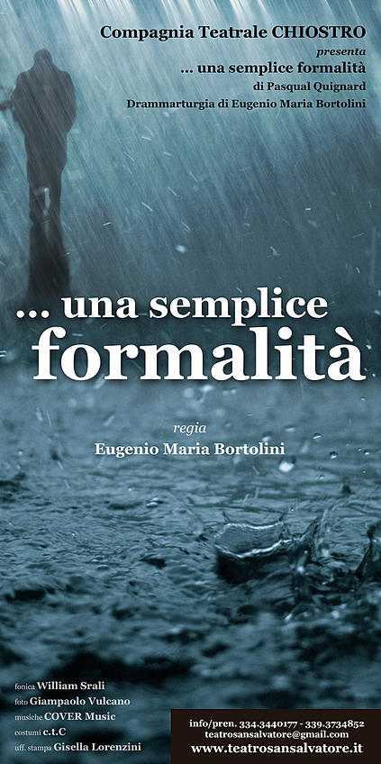 Vitruvio consiglia Una Semplice Formalità in scena al Teatro San Salvatore. Qui troveremo Eugenio Bortolini, smessi i panni del prof. Leporello, in scena con Marino Bellini per uno spettacolo che inchioda lo spettatore alla poltrona in un fluire dialettico, serrato ed accattivante, che lascia col fiato sospeso.